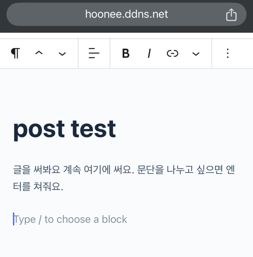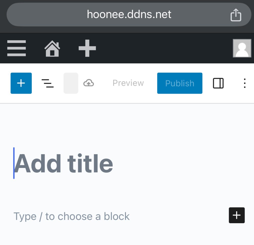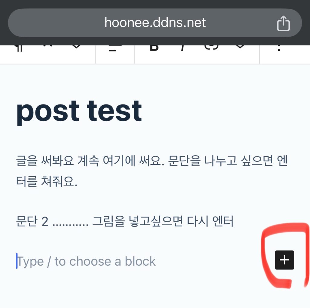 Add title에 제목을 입력해주고, 엔터를 쳐주면 검은색에 하양+ 가 있는 다음 블록으로 커서가 이동됨. Type / to choose a block 이곳을 클릭해도 됨. 여기부터 본문 입력하면 됨. 커서옮기고 그냥 치면됨.