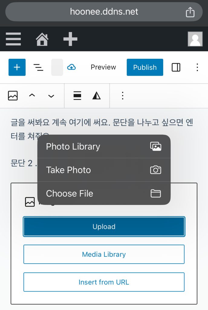 media library는 워드프레스에 업로드한걸 모아 놓은곳이고, url은 media 주소 입력하는 방법. 폰에 있는 사진을 업로드할려면 Upload 선택. 폰에 있는 라이브러리에서 선택하거나 (Photo Library), 바로 사진을 찍어 올릴수도 있음(Take Photo).