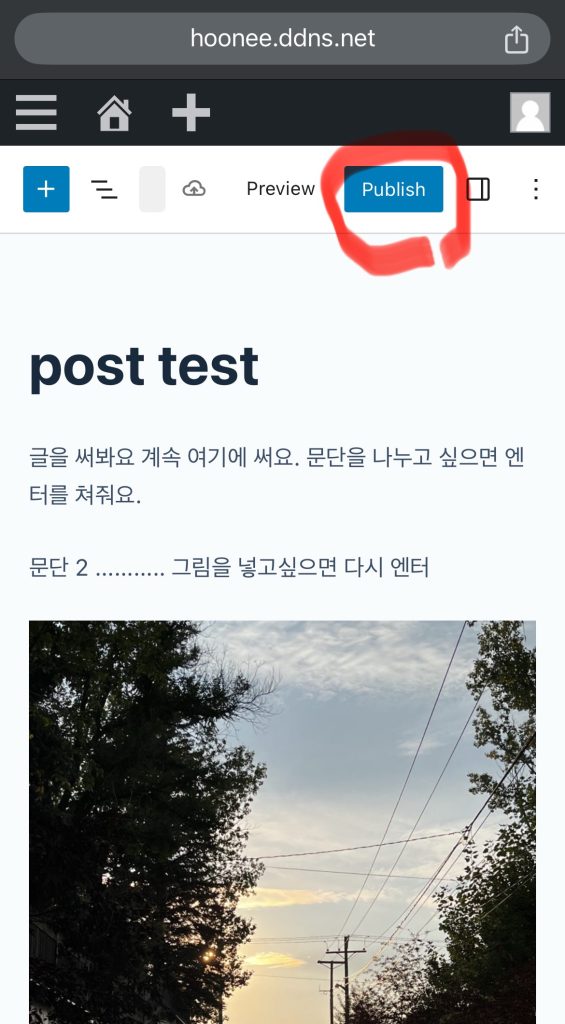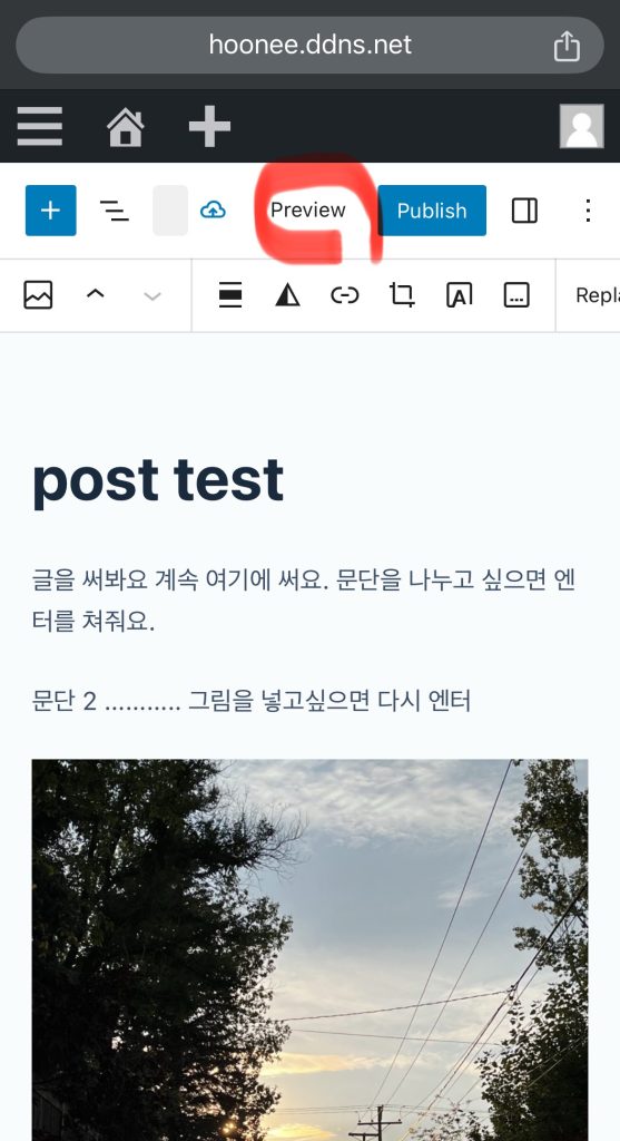 사진이 올라오고 글을 다 썼으면 preview 버튼을 눌러 등록하기 전에 확인할 수 있음.