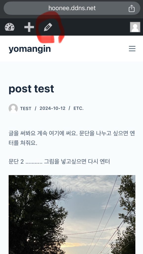 대쉬보드 +아이콘을 눌러도 되고, yomangin 홈 위에 있는 +를 누르고 post 를 선택하면 글 입력 페이지로 들어감.