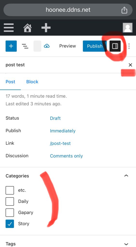 등록(publish)하기 전에 아래 표시한 아이콘 눌러 카테고리 선택. 선택안하면 기본 etc.로 등록되고, 나중에 변경할수 있음. (자신의 게시물 맨밑에 edit 아이콘 또는 대쉬보드 에서)
